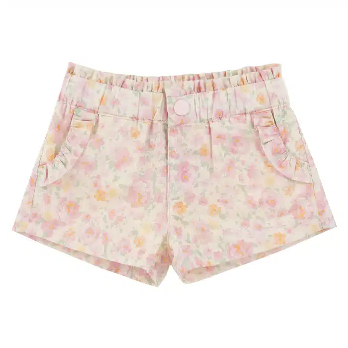Katoenen Short in een bloemenprint roze-crème-geel met vooraan 2 zakjes met rouches. Deze short heeft een verstelbare tailleband met vooraan een knopen sluiting.