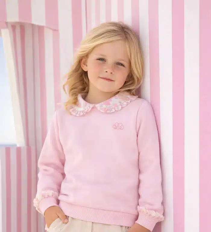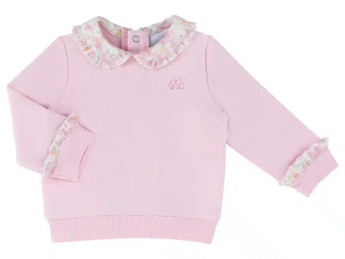 Lichtroze sweater afgewerkt met een kraag in bloemenprint. De kraag is afgewerkt met een ruffeltje in dezelfde bloemenprint net zoals het ruffeltje aan de mouw. De sweater heeft drukknopen achteraan zodat de sweater makkelijk over het hoofd kan worden getrokken.