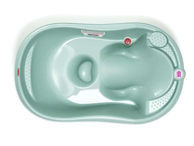 Babybadje met een ligpositie voor kleine baby’tjes en een zitpositie voor peuters. Met ingebouwde badthermometer om de watertemperatuur te controleren en een indicatie van het maximum waterniveau. Het badje kan apart gebruikt worden, met (apart te verkrijgen) regelbare badsteunen voor plaatsing op een groot bad, of in combinatie met de badstaander van OK Baby.