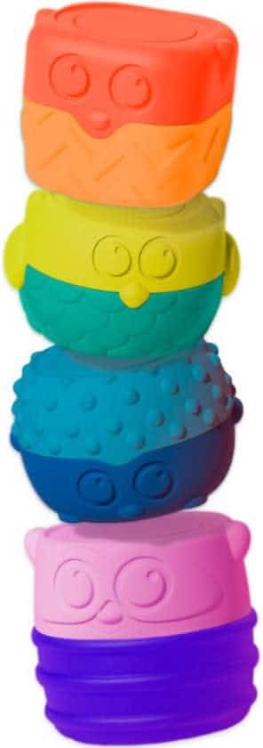 Magneten helpen baby’s een stapel te maken! Multi-color, multi-texture karakters hebben zachte, flexibele lichamen. Boven- en onderkanten hebben magneten om aan elkaar te blijven plakken. Stapel alle kleuren op elkaar om een regenboog van plezier te maken!