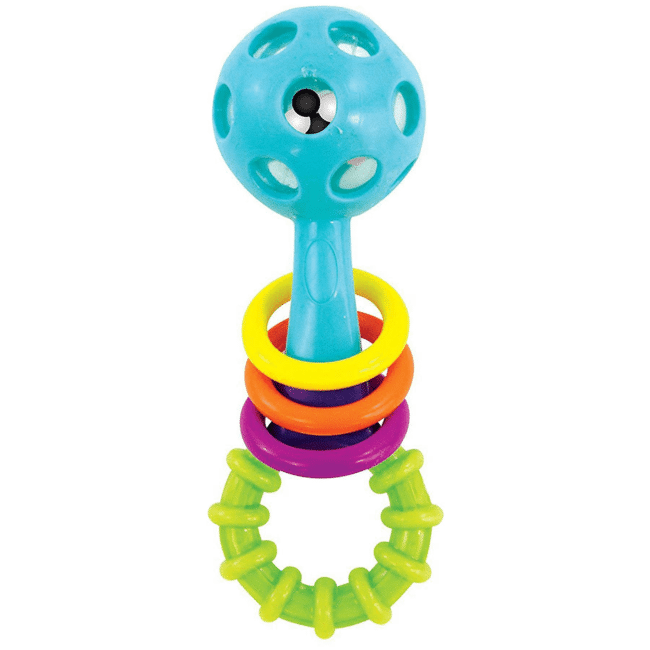 Deze zachte, squishy rammelaar is perfect voor baby’s. De felle kleuren, verschillende materialen en verschillende oppervlakken helpen de baby te stimuleren. Zelfs de nek van de rammelaar helpt bij de ontwikkeling van de baby door 180° te buigen, wat een perfecte manipulatie-uitdaging biedt voor kleine handjes. In de bol van de rammelaar zitten contrasterende zwart-witte kralen die het ontwikkelende zicht van de baby stimuleren en het auditieve bewustzijn wekken. Bovendien zorgen de felgekleurde klik-klak ringen voor auditieve stimulatie, terwijl het getextureerde handvat geweldig is om in de mond te nemen.