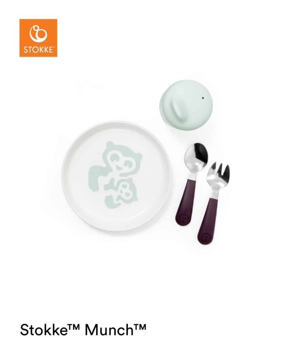 De Stokke® Munch Essentials wordt geleverd met anti-lek drinkbeker, ergonomisch bestek en bordje met antislip aan de onderzijde. Gemaakt van een hoge kwaliteit en veilig silicone. Het materiaal is sterk en duurzaam. Ons servies en bestek is kleiner en alleen geschikt voor kinderen. Het is ergonomisch, zodat kleine handjes alles zelf kunnen vasthouden. En dat is nog niet alles… ieder product is ontworpen om kindjes te stimuleren om zelf te eten en drinken.