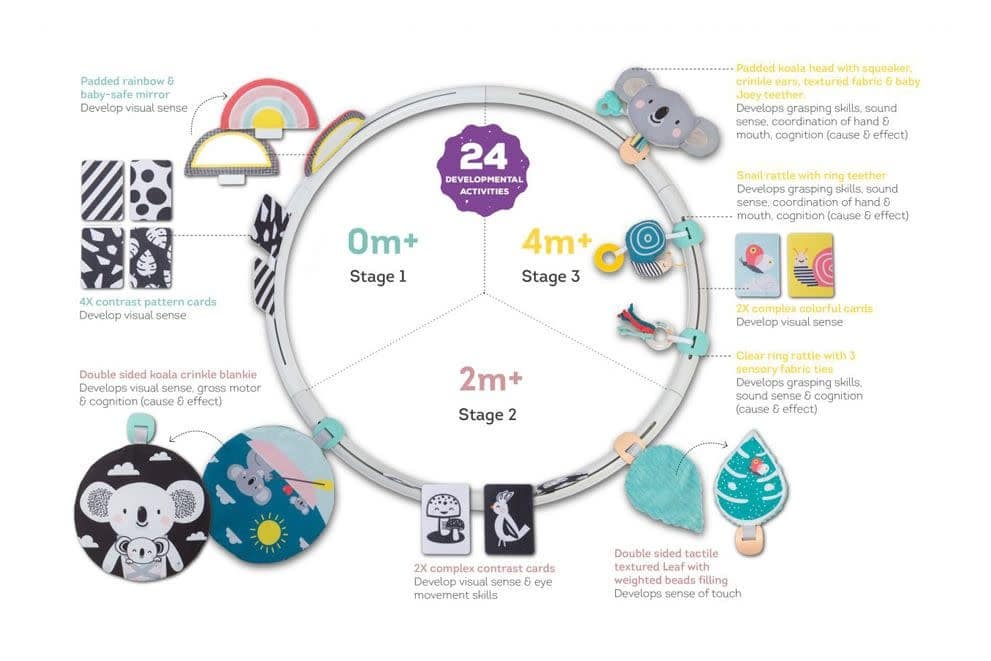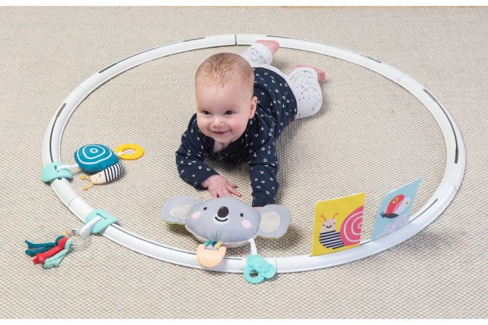 Uniek product voor pasgeborenen en baby’s. Een hoepel die rondom de baby loopt en hem voldoende op leeftijd afgestemde activiteiten biedt om tijdens het spelen verschillende lichaamshoudingen te oefenen. Het verkennen van de verschillende texturen en geluiden zal helpen om de zintuigen, de motoriek en de cognitieve ontwikkeling van de baby te bevorderen. De hoepel reikt je baby 24 activiteiten voor 3 ontwikkelingsfases aan. Een spiegeltje, rammelaars, knisperende speeltjes en vilten kaarten met contrasterende of kleurrijke illustraties zorgen ervoor dat je baby gestimuleerd wordt om op z’n zij of op z’n buik te spelen.