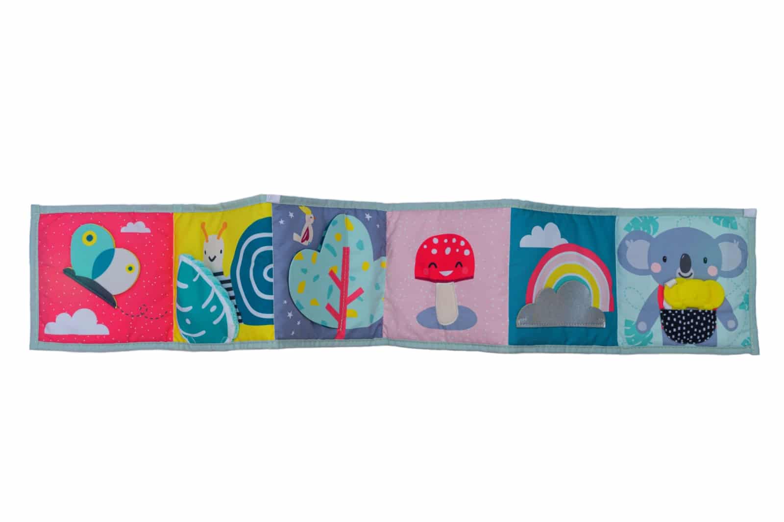 Leuk ontdekkingsboekje met 2 zijden voor 2 ontwikkelingsfases van het kind. Fase 1 (0-3 maanden): contrastrijke kleuren en patronen, babyve ilige spiegel en getekende gezichten voor visuele stimulatie om de zintuigen en emotionele intelligentie van de baby te ontwikkelen. Fase 2 (3 maanden+): rijke kleuren, texturen, grappige illustraties en bijtring om de fijne motoriek van de baby helpen te ontwikkelen. Dit boekje is geschikt voor gebruik in de wieg, in de kinderwagen of op de speelmat. Het boekje wordt geleverd met twee plastic clips voor eenvoudige montage aan een draagwieg.