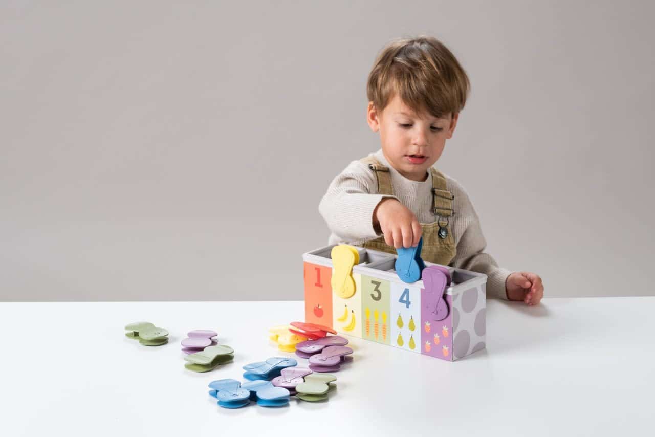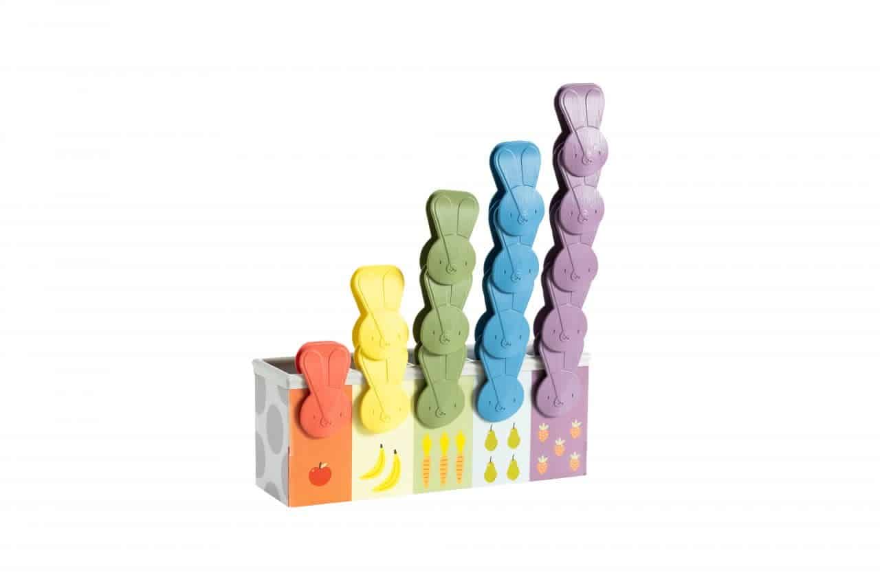 Het Count & Match Bunny spel helpt peuters om hun fijne motoriek, kleurherkenning en telvaardigheden te ontwikkelen. Het spelletje bestaat uit een rijk geïllustreerde dubbelzijdige doos en 15 konijnenknijpers. Naar gelang de leeftijd van het kind kan je het spelop verschillende manieren spelen: vanaf 18 maanden kan je kleintje de konijntjes losmaken en in de doos stoppen, geleidelijk aan leren ze deknijpers op de rand van de doos te bevestigen. Vanaf 24 maanden bevestigt je peuter de konijntjes op de doos bij de juiste kleur en vanaf 30 maanden kan je peuter leren om de knijpers te sorteren op kleur en aantal.