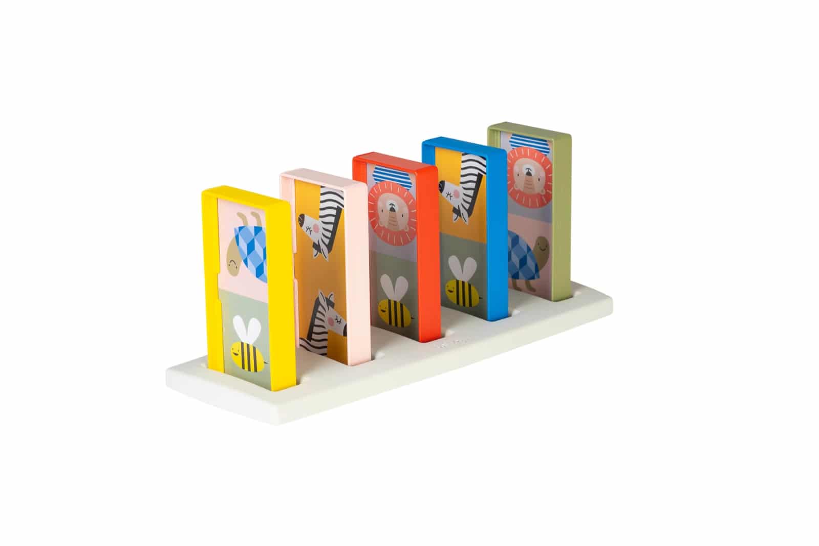 Domino is hét ideale spel om met peuters te spelen. De regels zijn eenvoudig en het spel helpt kinderen hun visuele vaardigheden, fotografisch geheugen én motorische en cognitieve vaardigheden te ontwikkelen. Deze domino kan je op verschillende manieren spelen, voorverschillende leeftijden en dus verschillende ontwikkelingsfases: domino rally met de houder – domino rally met matchen, herkennen en benoemen van kleuren – domino met het matchen van afbeeldingen – domino met het herkennen van vormen en aantallen – domino rally zonderde houder. De supergrote, dubbelzijdige dominostenen (6x12cm) passen perfect in kleine handjes, aan de ene kant staan er illustraties op, aan de andere kant geometrische vormen en aantallen. Dit dominospel groeit mee met je peuter en bevordert de fijne motoriek, cognitieve vaardigheden, hand-oogcoördinatie, kleur- en vormherkenning. Inclusief1 plastic houder.