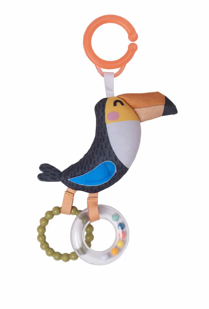 Vrolijke toekan met rinkelende snavel, een rammelende ring met kleurrijke kralen en een bijtring met structuur. Afmetingen: 18cm