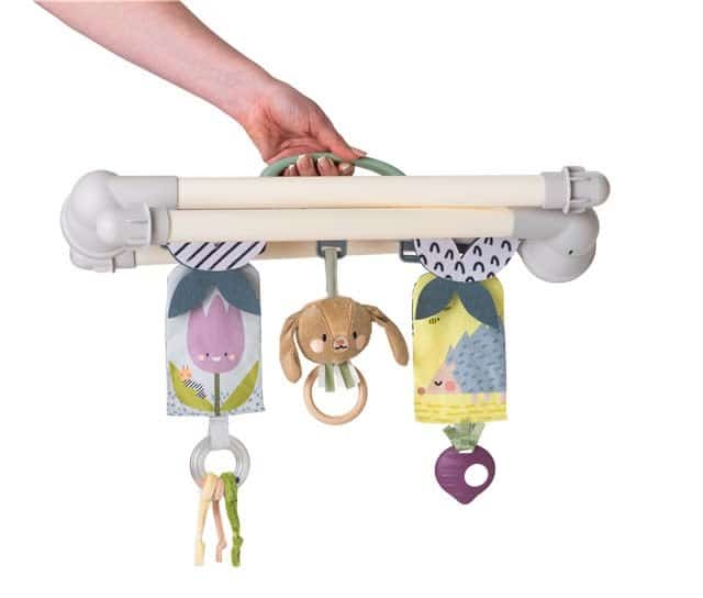 Stijlvolle speelmat met opvouwbare baby gym, ideaal voor onderweg. De baby gym heeft een dubbelzijdig ontwerp voor 2 ontwikkelingsstadia om baby’s zintuigen en motorische ontwikkeling te stimuleren. De contrasterende kleuren, met vlindermobiel en baby-veilige spiegel, zijn geschikt vanaf 0 maanden. De kleurrijke illustraties met rammelaar en bietenbijtring zullen je baby vanaf 2 maanden entertainen. Dankzij de opvouwbare poten en het handvat, neem je deze baby gym gemakkelijk overal mee naartoe. De 4 afneembare, multisensorische hangspeeltjes stimuleren de ontwikkeling van baby’s zintuigen, fijn en grove motoriek en oog-handcoördinatie.