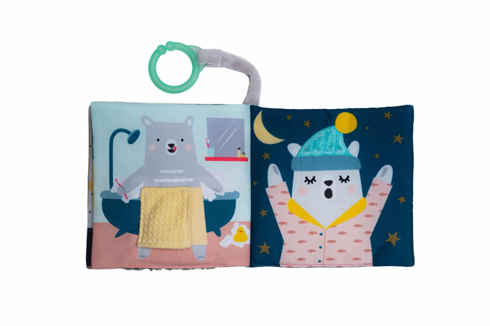 Een uniek en aantrekkelijk zacht voelboekje over Paul de beer die graag van outfit wisselt. Het boekje kan makkelijk aan de wandelwagen worden bevestigd voor speelplezier onderweg, maar zorgt ook thuis voorquality time als je met je baby praat over je dagelijkse activiteiten en de outfits die je ervoor nodig hebt. Van zomerse zwemshorts naar feesthoedjes en uiteindelijk hup het bad in en je pyjama aan. Door samen het verhaal van deze vrolijke beer te lezen verrijk je je baby’swoordenschat. De geluiden, verschillende stofjes en texturen zorgen ervoor dat je baby op ontdekking zal willen gaan en zo wordt dan weer zijn fijne motoriek bevorderd.