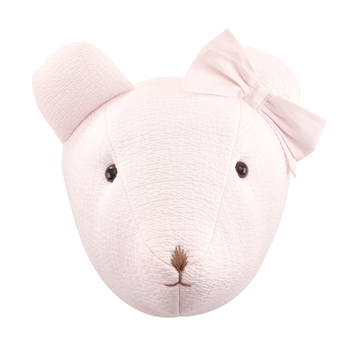 Théophile Beer Trofee, Cotton Pink collectie, in roze gewafeld katoen. Speels en decoratief. Versier de babykamer met elegantie. Om aan de muur te hangen met een spijker, aan de achterkant van het hoofd.