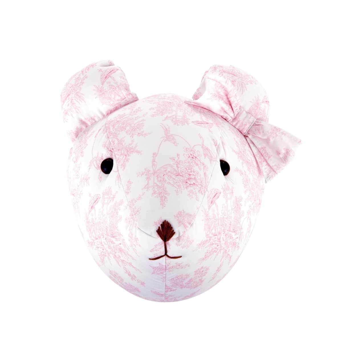 Théophile Beer Trofee, Cotton Pink collectie, in roze gewafeld katoen. Speels en decoratief. Versier de babykamer met elegantie. Om aan de muur te hangen met een spijker, aan de achterkant van het hoofd.