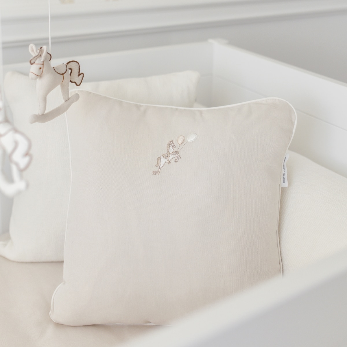 Kussen van het “Carrousel” thema voegt een elegant tintje aan de inrichting van de babykamer.