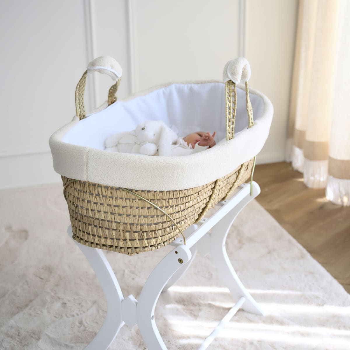 Rieten Reiswieg en namaak schapen aankleding, matras inbegrepen (Voetenzak en hoeslaken niet inbegrepen)
