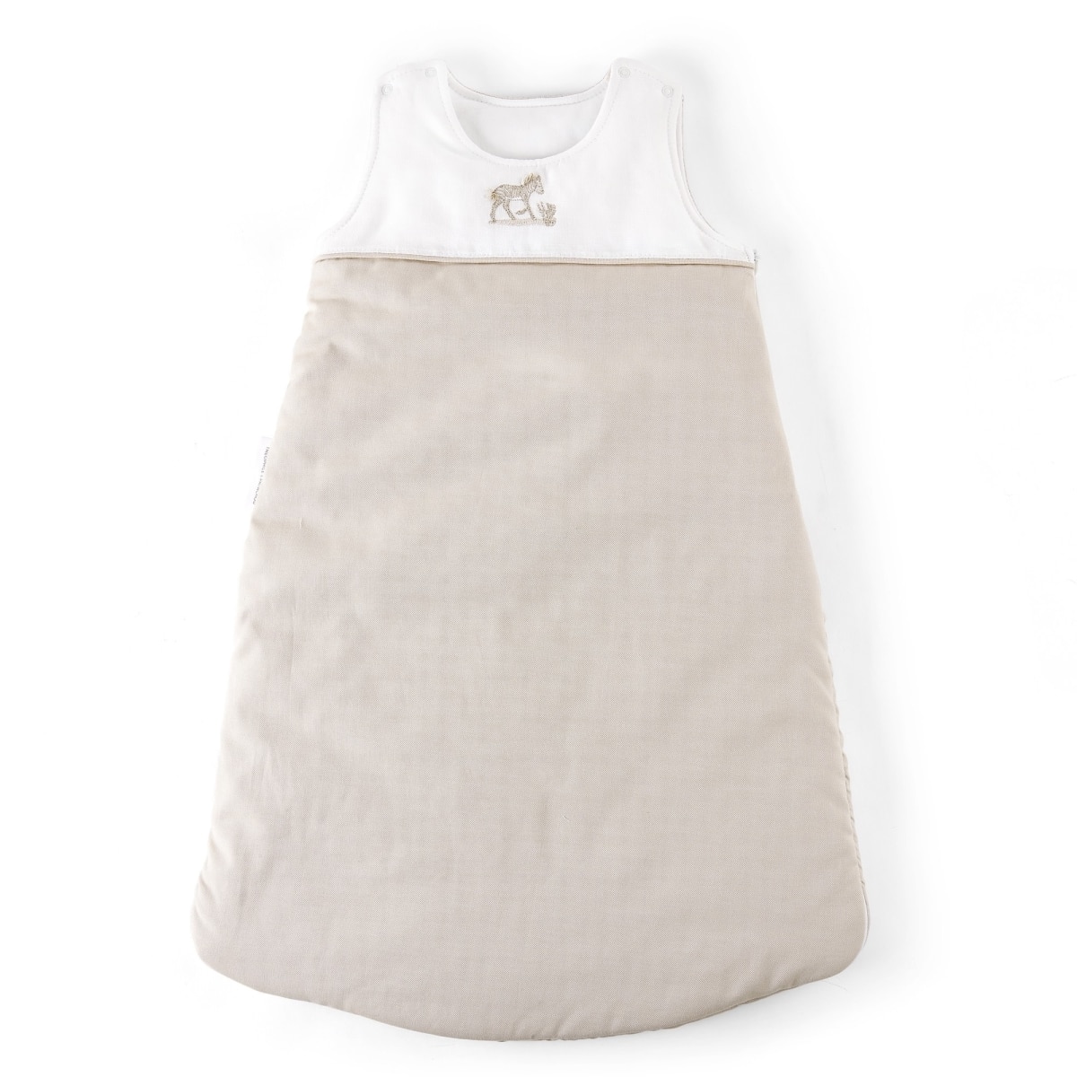 Slaapzak in katoen geritst op de omtrek. Makkelijk aan te trekken met twee drukknopen op de schouderbanden