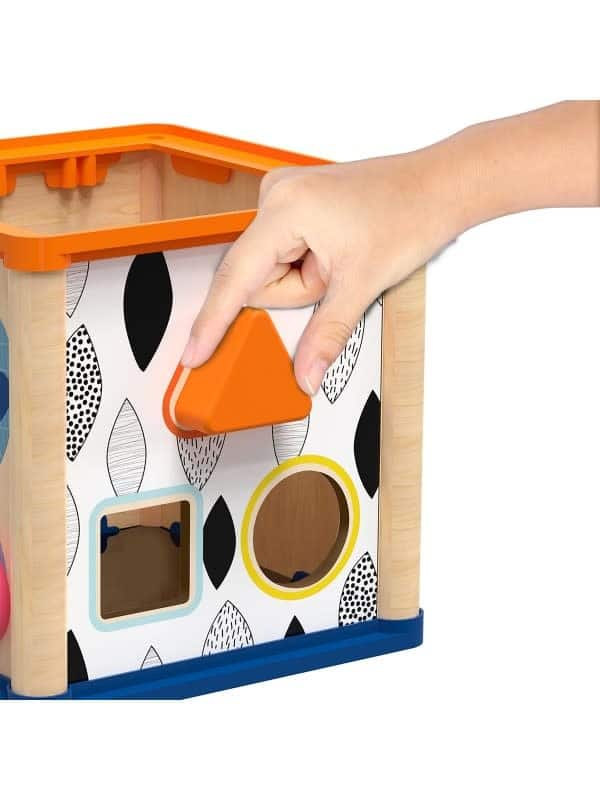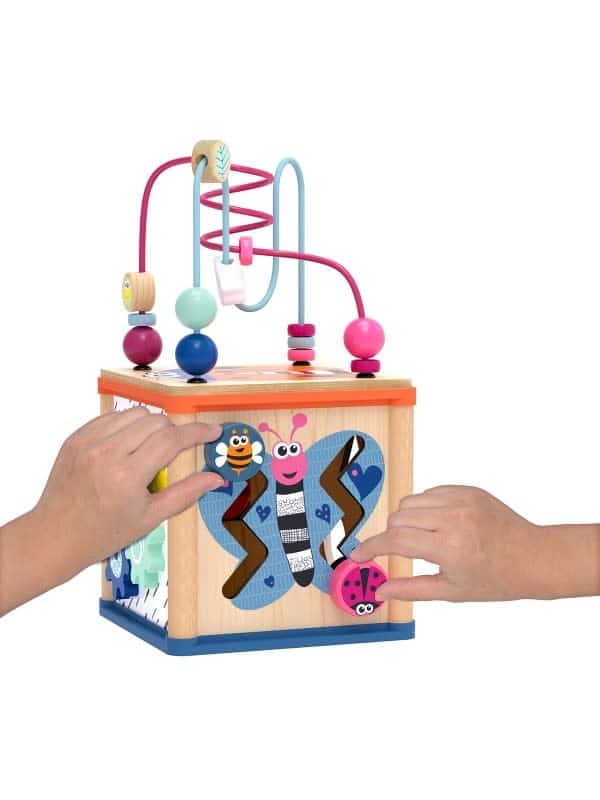 Het stijlvolle design van de kubus in trendy unisex kleuren nodigt baby’s en peuters vanaf 12 maanden uit om te spelen en te leren. Contrasterende patronen in zwart en wit bevorderen ook de visuele ontwikkeling van baby’s en peuters. Naast een uitneembaar kralendoolhof biedt het gevarieerde speelcentrum ook een sorteerspel, een klok met bewegende wijzers en tandwielen om te draaien. Een grote verscheidenheid aan vormen, kleuren en bewegingen stimuleren onafhankelijk spel – en bevorderen op speelse wijze hand-oogcoördinatie, verbeeldingskracht en creativiteit, evenals kleur- en vormherkenning.