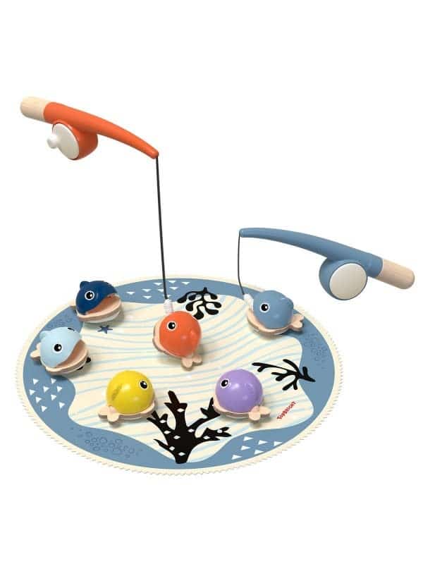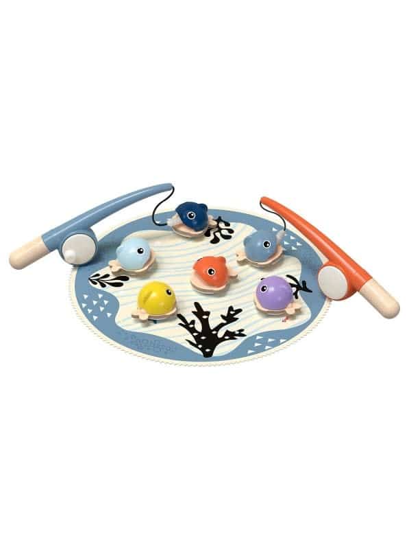 De set bestaat uit zes magnetische, driedimensionale vissen in moderne kleuren die inspireren om te spelen, twee functionele hengels van hout met realistische molens en een zachte stoffen mat als basis. Of ze nu alleen of met anderen spelen – tijdens het vissen oefenen kinderen hun behendigheid, fijne motoriek en oog-handcoördinatie.