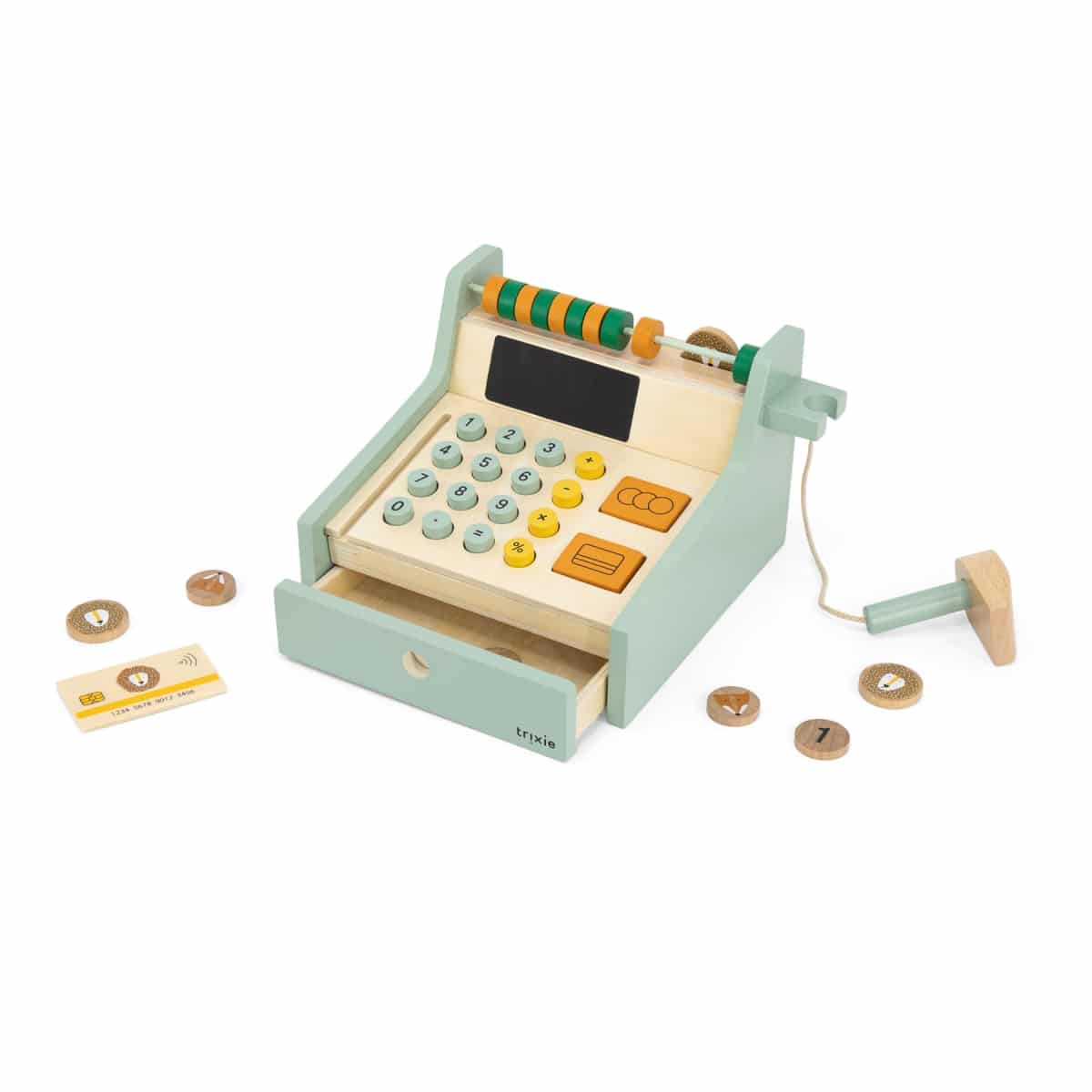 Aan deze leuke kassa ontbreekt niets! Scan eerst alle artikelen in je winkelwagentje met de handige scanner die aan de zijkant van de kassa zit. Zodra je het totaalbedrag hebt, steek je je munten in de gleuf; bij ieder muntje rinkelt de bel. Het telraam bovenaan de kassa helpt je om bij te houden hoeveel er betaald is. Geen geld meer? De kassa heeft naast munten ook een bankpas en een terminal om met de bankpas te betalen. De kassa is voorzien van leuke drukknoppen en de lade schuift gemakkelijk open om alle munten te kunnen pakken. Ideaal speelgoed voor urenlang vertier dat tegelijkertijd rekenen en de fijne motoriek stimuleert.