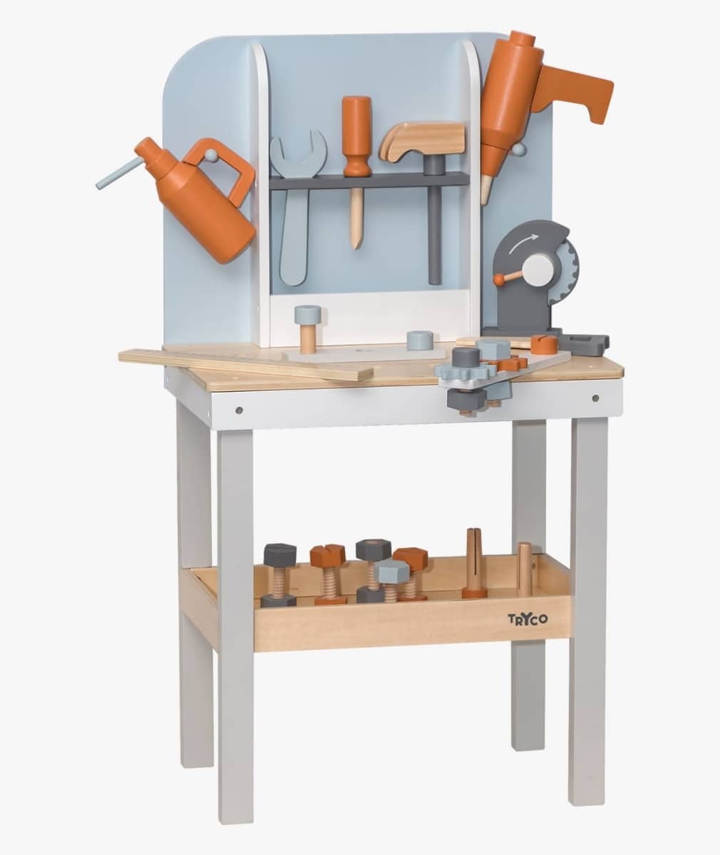 Met deze werkbank stimuleert het kindje op een speelse manier zijn of haar verbeelding en motoriek. Inclusief: 6 bouten, 6 moeren, cirkelzaag, moersleutel, tang, oliekan, liniaal, boormachine, zaag, hamer, 3 tandwielen en 3 montagevormen.