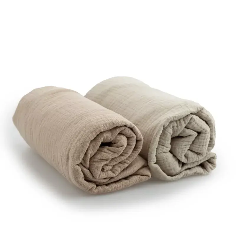 Mousseline crêpe stof, bekend van de hydrofiele doeken, is een licht en zacht geweven stof van getwiste garen, waardoor een herkenbare gekreukte structuur ontstaat. Hierdoor is het niet nodig om de lakentjes te strijken.