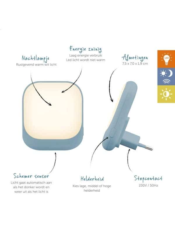 Dit nachtlamp steek je makkelijk in het stopcontact. Dankzij het zacht oranje led licht zal je kindje geen volledige donkere kamer hebben en zachtjes in slaap vallen. Ook ideaal voor als je kindje s’ nachts naar het toilet moet. Dankzij de sensor gaat het licht automatisch aan het donker wordt en weer uit als het licht genoeg is. Het nachtlampje beschikt bovendien over drie verschillende lichtsterktes.