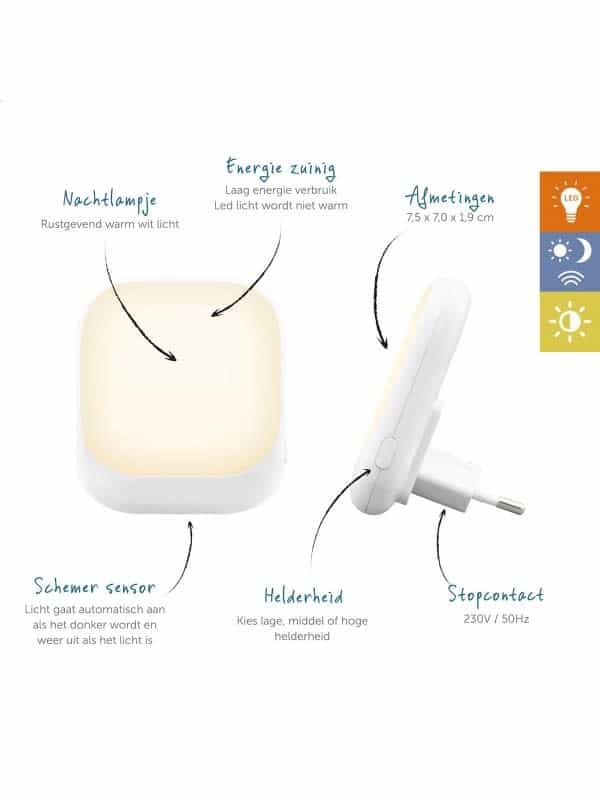 Dit nachtlamp steek je makkelijk in het stopcontact. Dankzij het zacht oranje led licht zal je kindje geen volledige donkere kamer hebben en zachtjes in slaap vallen. Ook ideaal voor als je kindje s’ nachts naar het toilet moet. Dankzij de sensor gaat het licht automatisch aan het donker wordt en weer uit als het licht genoeg is. Het nachtlampje beschikt bovendien over drie verschillende lichtsterktes.