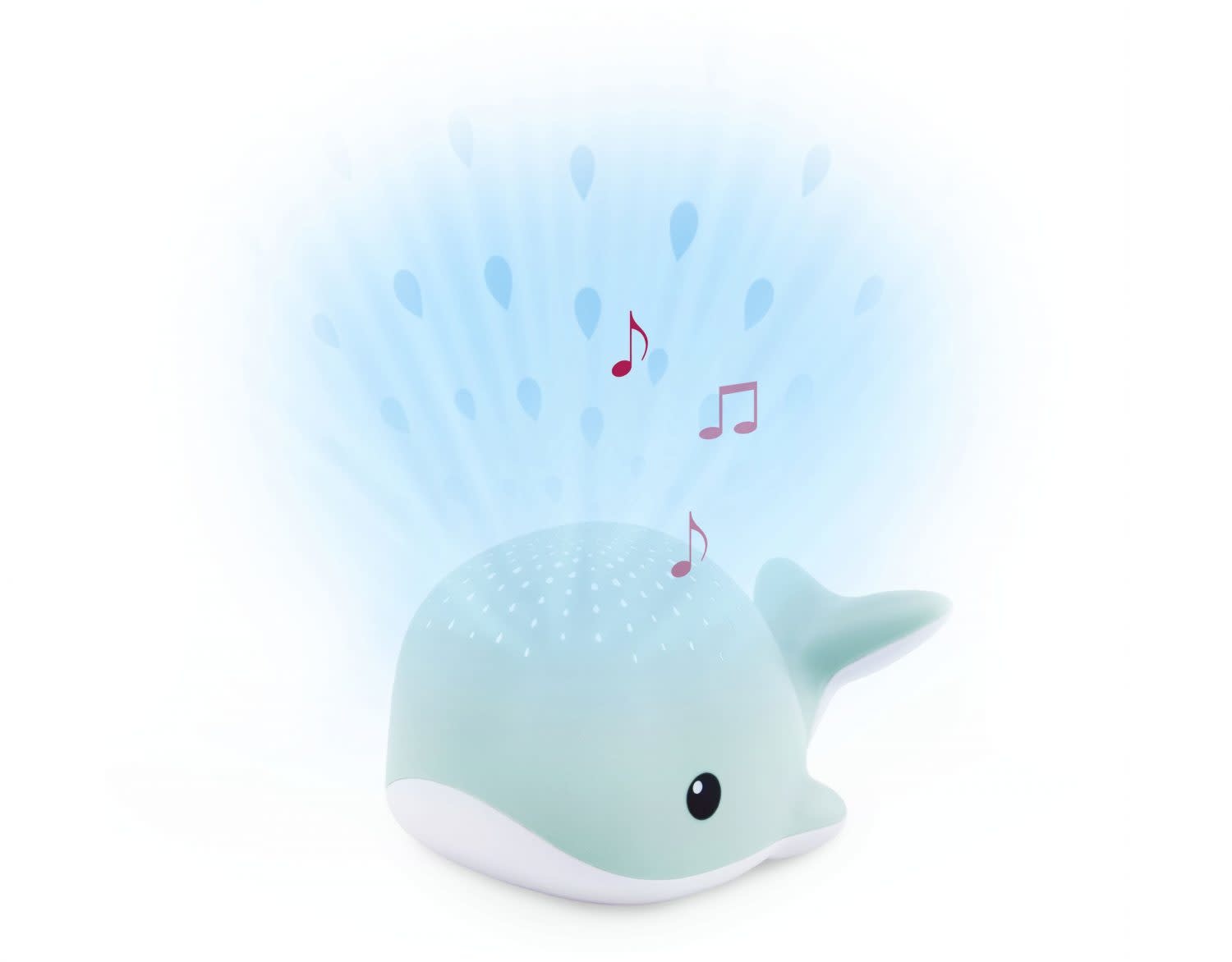 Wally de walvis is een lichtprojector met rustgevende melodieën. De projectie toont waterdruppels in rood, blauw, groen of veelkleurig, terwijl het rustgevende oceaangeluiden kan spelen, de hartslag van een moeder of loungemuziek nabootst. Na 30 minuten schakelt Wally automatisch uit. Wally’s huilsensor schakelt de projector in wanneer je kleintje begint te huilen en de walvis kan aan de wieg worden bevestigd (inclusief klittenband). Werkt op 3x AA-batterijen (niet inbegrepen).