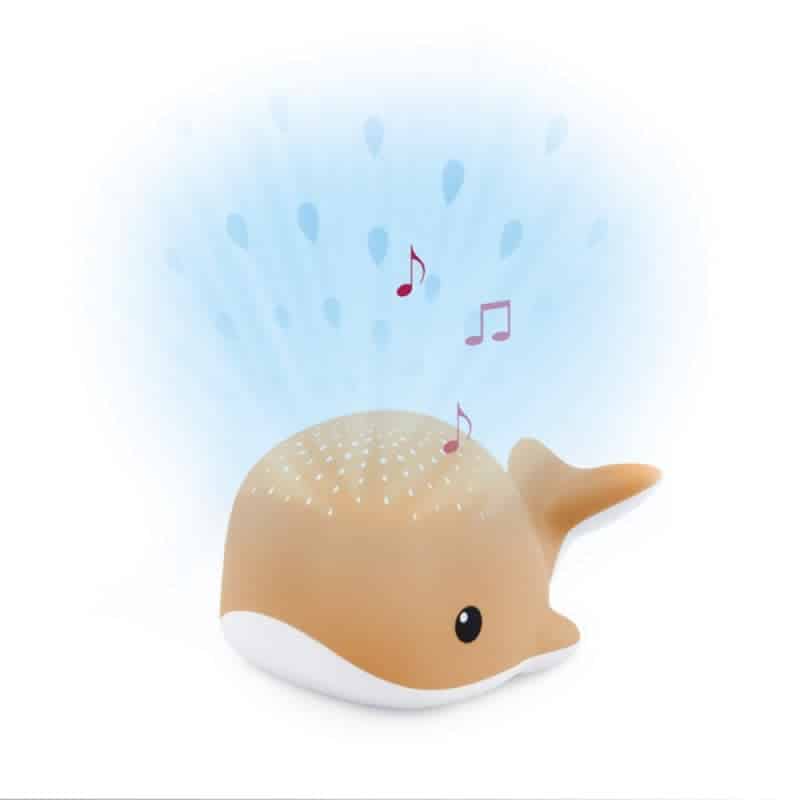 Creëer een magische hemel in de kinderslaapkamer! Wally de walvis zal hectische bedtijdmomenten veranderen in rustige slaapmomenten door het projecteren van waterdruppels op het plafond van de slaapkamer. Ondertussen kunnen er kalmerende oceaangeluiden, hartslaggeluiden of traditionele slaapliedjes afgespeeld worden. De muziek gaat automatisch uit na 15 minuten, de projectie na 30 minuten. Wanneer uw baby begint te huilen, zal de huilsensor de projectie automatisch inschakelen. U kan Wally vastmaken aan het kinderbedje of naast het bed plaatsen.