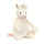 De verlegen eenhoorn is knuffelzacht met een roomkleurige vacht, roze neus en oortjes, een lange roze staart en manen en een holografische hoorn.