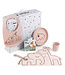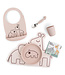 The Dinner time goodie box combines five of the Done by Deer bestselling dinnerware items in a cool giftbox. The set includes a Silicone plate, a Silicone mini mug, a Silicone bib, a Silicone placemat and an Easy-grip spoon. The practical silicone dinnerware is shatterproof and has anti-slip and easy-grip features. It is safe to use in the oven, microwave and freezer and is suitable for cleaning in the dishwasher. Includes a free Deer Friends book. The tableware giftbox is filled with silicone dinnerware in a soft powder shade. The sturdy white cardboard box is decorated with our classic black contour print and is perfect for storage in the kids' room. A perfect gift idea for all little eaters!