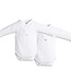Duopack met 2 meisjes body's met lange mouwen. 1 lijfje met klein geborduurd grijs kroontje en 1 lijfje met roze geborduurd kroontje. De FIRST body is ontworpen voor het comfort en gebruiksgemak van je baby door de praktische opening aan de voorzijde - normale pasvorm lange mouw.