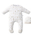 De Beige Replay Set is een luxe 2-delige geschenkset, prachtig verpakt in FIRST luxe verpakking. De set bevat een rompersuit (ref 9903116) gemaakt van bedrukt Replay-jersey, versierd met een geborduurde kroon en delicate beige piping op de voetjes. De set wordt geleverd met een bijpassende bonnet (ref 9905016).