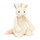 De verlegen eenhoorn is knuffelzacht met een roomkleurige vacht, roze neus en oortjes, een lange roze staart en manen en een holografische hoorn.
